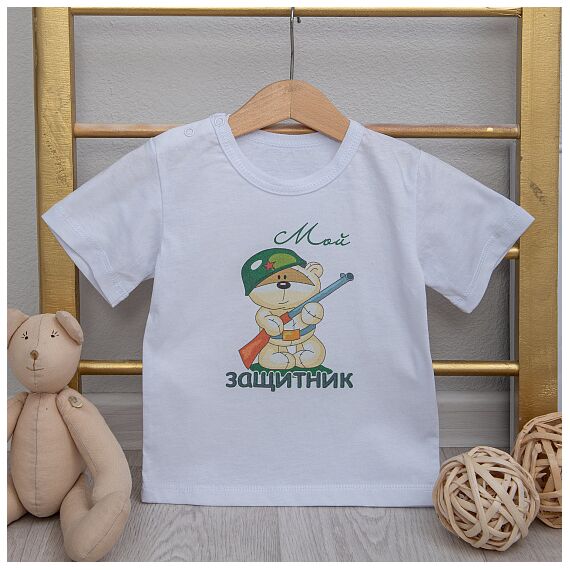 Футболка детская с праздничным принтом "Мой защитник" , ткань кулирка белая, молочная, состав хлопок 100%