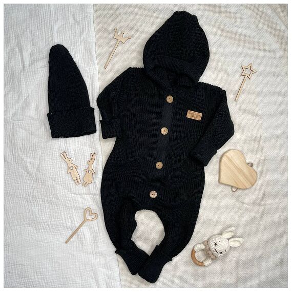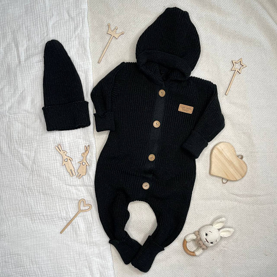 Летним малышам вязаные вещи тоже могут пригодиться, чтоб утеплиться к вечеру или в прохладную погоду, которая нередко бывает в начале или конце сезона. Вязанный комбинезон в модном черном цвете. Комбинезон с капюшоном на пуговицах.