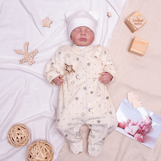 Комбинезон из молочного вельбоа с рельефным рисунком, модель на кнопках с закрытыми ножками.