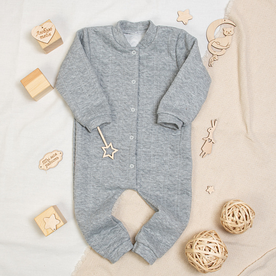 Удобный детский комбинезон из серого капитония на кнопках. Рукава и штанины на манжетах, Модель создана как для самостоятельного ношения, так и в качестве утеплителя или поддевы.
