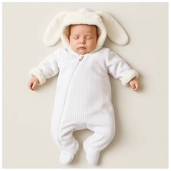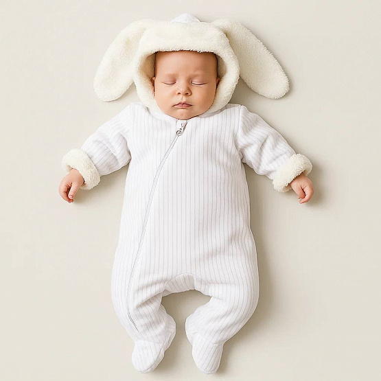 Удобная застежка на молнии и теплый капюшон, отороченный мерлушкой, согреют малыша и подарят ему мягкость и комфорт.