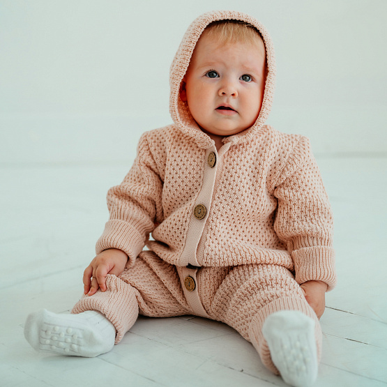 Вязанный комбинезон с глубоким капюшоном, на пуговицах с растущими манжетами.