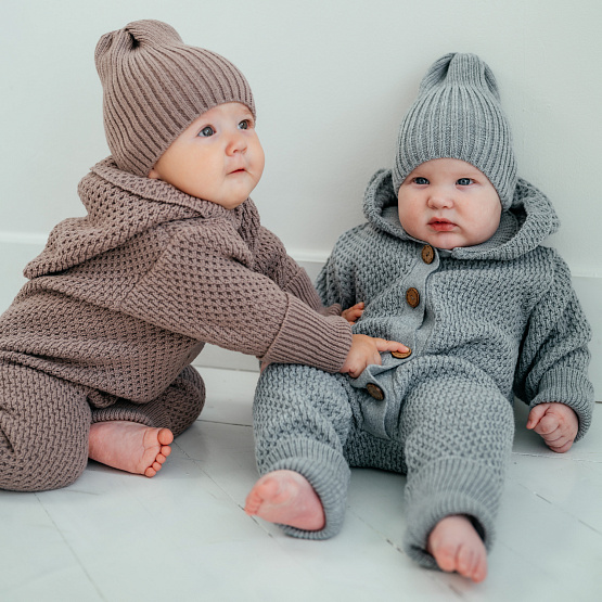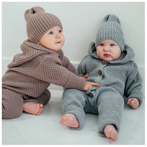 Вязанный комбинезон с глубоким капюшоном, на пуговицах с растущими манжетами.