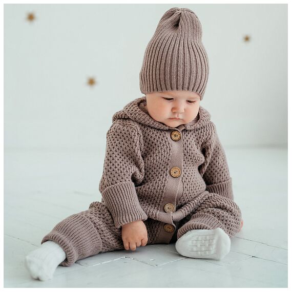 Вязанный комбинезон с глубоким капюшоном, на пуговицах с растущими манжетами.