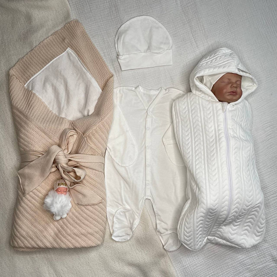 2. Пеленка-кокон с капюшоном, на молнии. С подкладом из 100% хлопкового трикотажа внутри и красивой рельефной ткани капитоний косичка белого цвета. Размер на рост 0-3 мес