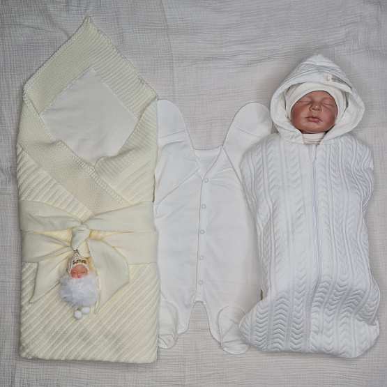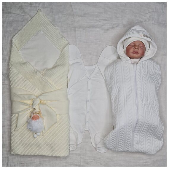 2. Пеленка-кокон с капюшоном, на молнии. С подкладом из 100% хлопкового трикотажа внутри и красивой рельефной ткани капитоний косичка белого цвета. Размер на рост 0-3 мес