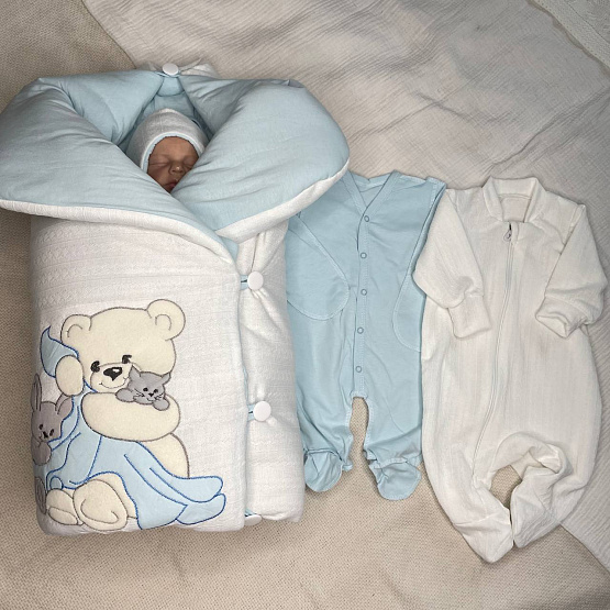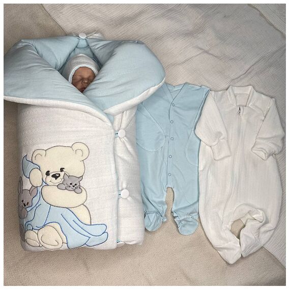 1 Конверт-одеяло на 4х пуговицах. С милой вышивкой. Размер 100/100 см. Трансформируется в полноценное одеяло для малышей, которое можно использовать до достижения ребенком 2-3 лет.