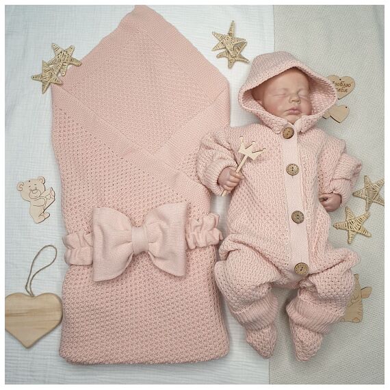 Вязаный комплект на выписку в цвете пудра. Упакован в тубус.