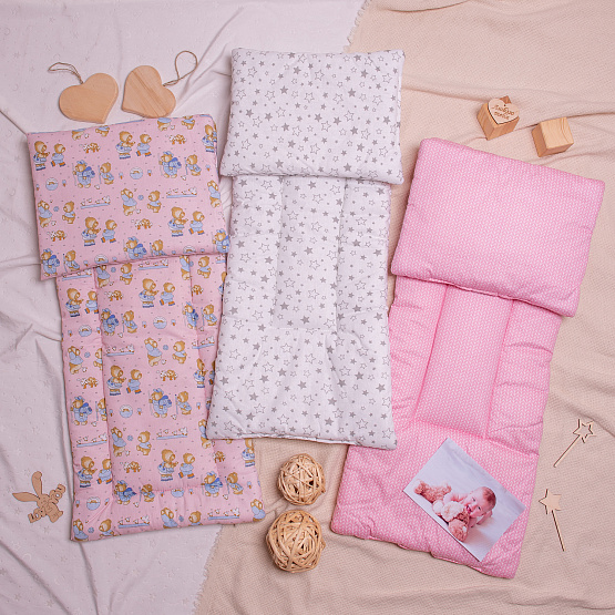 Удобный комплект матрасик и подушечка, создаст комфортное пребывание для малыша в коляске, можно использовать на полу в комнате, на природе.
