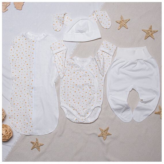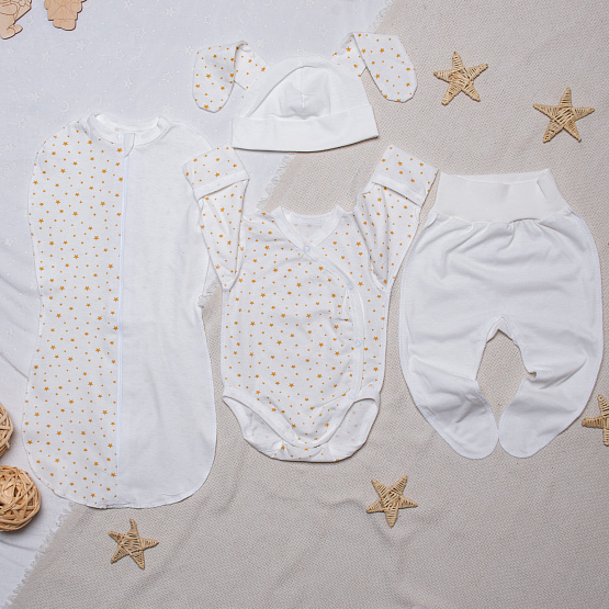 Комплект создан из молочного трикотажного хлопка. Подходит для новорожденных для выписки из роддома и повседневного ношения. Хорош в качестве подарка на рождение малыша.