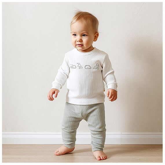 Лонгслив молочного цвета, костюма украшен вышивкой в виде милых динозавриков, а ручки на манжетах добавляют особый стиль. Кнопки на плече для удобство одевания. Штаны серого цвета, на растущих манжетах, что обеспечивает комфортную посадку и облегчает движение.
