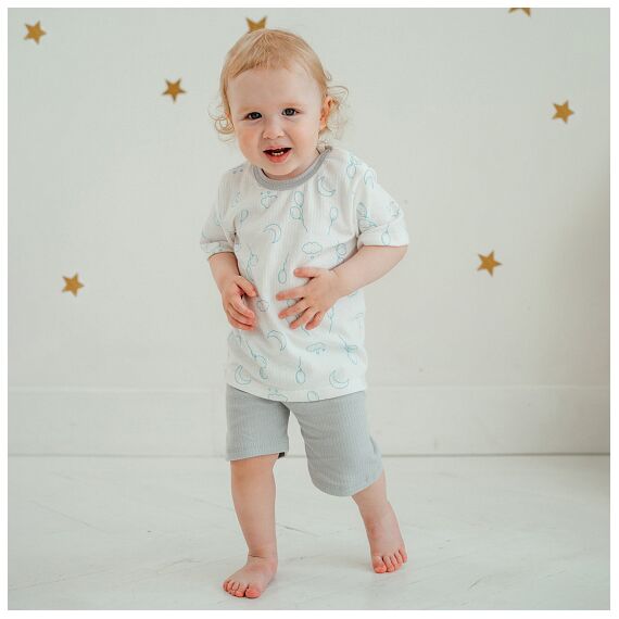 Футболка с двумя кнопочками на плече для удобства продевания головы ребёнка. Рукава короткие. Горловина окантована.