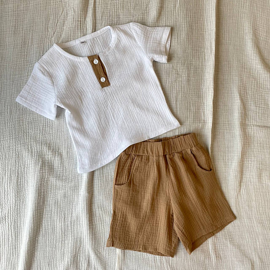 Детский летний костюм из муслина, футболка и шорты – очень практичная одежда для дома, садика, а также прекрасный вариант детской одежды для пляжа и отдыха. Костюм подойдет для путешествий, поездок на дачу, прогулок, активного отдыха. Особенность муслиновой ткани в том, что несмотря на ее легкость и практически невесомость, она очень прочная и долговечная. Муслиновый костюм для детей - незаменимый атрибут пляжного отдыха. Он быстро сохнет, не мнется, не требует глажки, но при этом обладает солнцезащитным свойством и не даст вашему малышу сгореть.