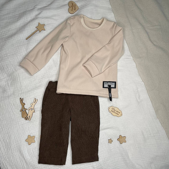 Брюки комфортной ширины рассчитаны специально малышам с учётом памперса. Пояс на резинке. Карманы "как у папы". Материал: микровельвет.