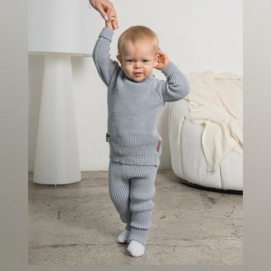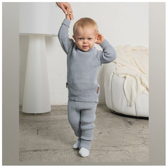 Вязаный костюм состоит из свитера и прямых брюк с регулирующими завязками и растущими манжетами, что позволяет легко подогнать его под размер ребенка. Комплект станет отличным подарком для любого ребенка.