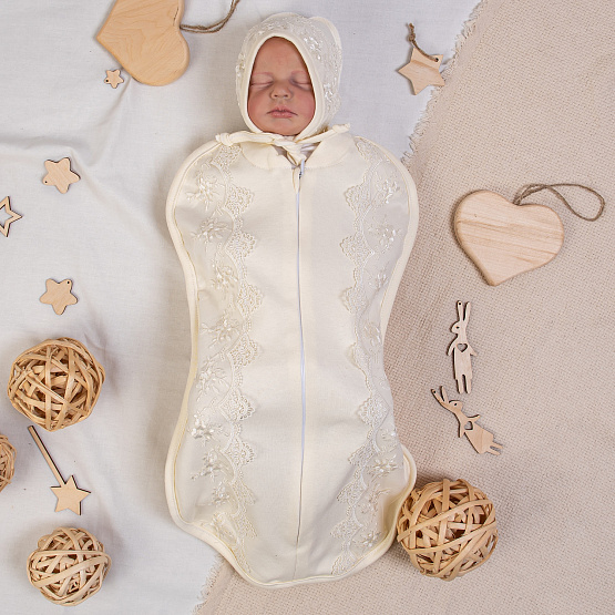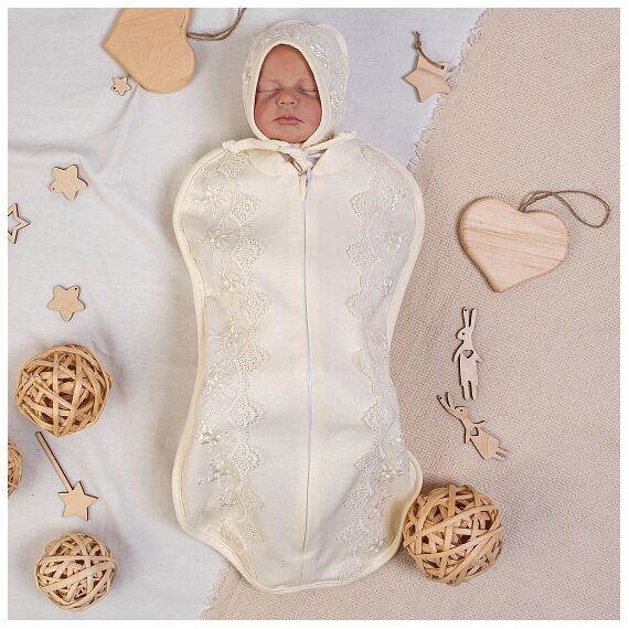 Пеленка-кокон на молнии с шапочкой, ткань молочный интерлок, турецкое кружево, р-р 0-3 мес.