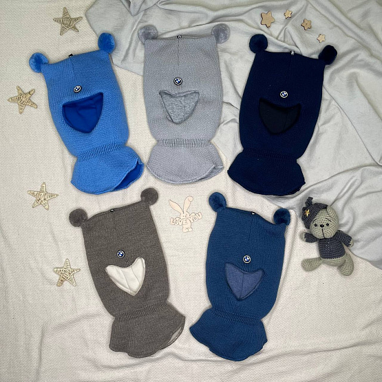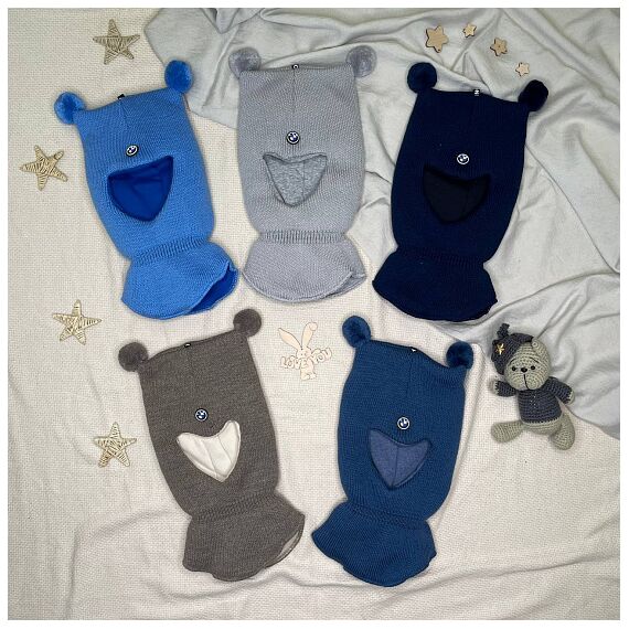 Теплая шапка-шлем для мальчиков от 2 до 5 лет. .Однотонный шлем дополнен забавными ушками-помпонами.