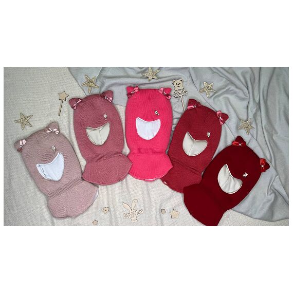 Теплая шапка-шлем для девочек от 2 до 5 лет. .Однотонная вязка дополнена декоративным элементом и бантиками на ушках.