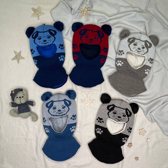 Теплая шапка-шлем для мальчиков от 2 до 5 лет. Вязаный узор в виде мордочки и лапок дополнен забавными ушками-помпонами