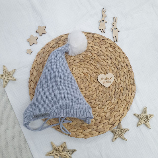 Шапочка вязаная с помпоном "Гномик" серая р 0-3 мес