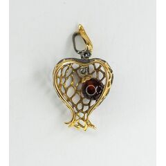 Подвеска женская из гипоаллергенной бронзы с позолотой и родированием. Вставка- нат.янтарь коричневого цвета в форме шарика ( размер камня-0,5/0,5см). Высота подвески- 3,0см, ширина-2,0см.