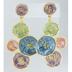 Серьги из гипоаллергенного ювелирного сплава желтого цвета. Покрытие эмалью, цвет- розовый, синий, фиолетовый. Высота серег-5,0см, ширина-3,0см. Застежка- пусет.
