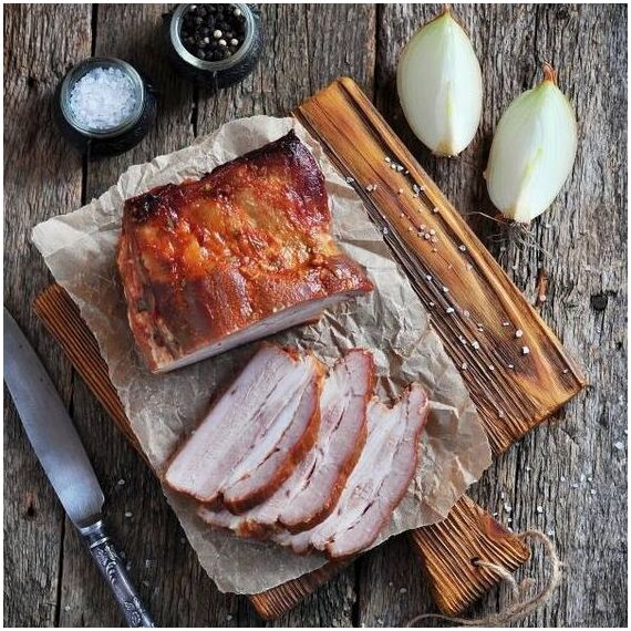 Грудинка Пикантная мясной деликатес очень сочный и нежный, так как у нее есть небольшие прослойки жира.Прекрасно подойдет для бутербродов на завтрак.
