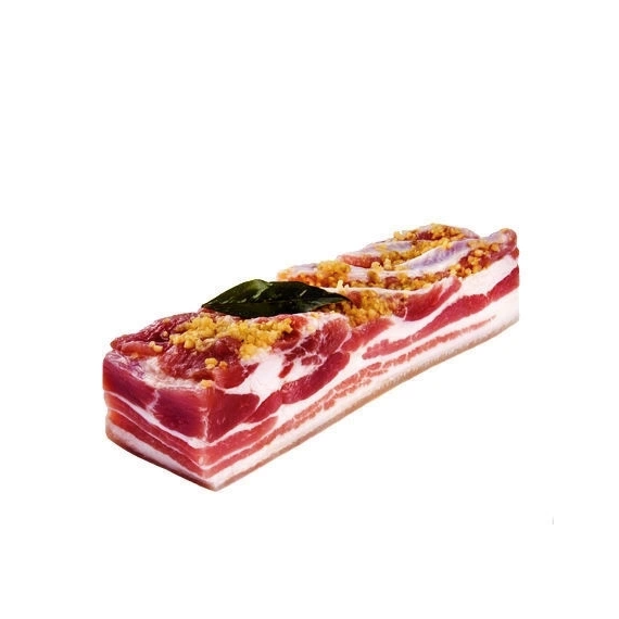 Солёная свиная грудинка. Пряный вкус ей придаёт натирка специями, чесноком, добавление лаврового листа.