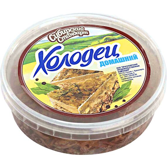 Холодец СИБИРСКИЙ СТАНДАРТ Домашний – это традиционная, русская, холодная закуска, при приготовлении которой используется мясной бульон, отборная говядина, ароматные специи. Блюдо готово к употреблению, рекомендуется подавать его на стол с хреном и горчицей.