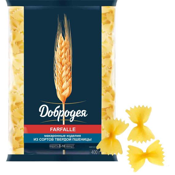 Фарфалле ТМ «Добродея» - изготовленны из твердых сортов пшеницы. Макаронные изделия в форме бабочек. За оригинальную форму их особенно любят дети. прекрасно сочетаются с лёгкими соусами на основе овощей. Используются в приготовлении различных салатов и сочетаются как с традиционными (томатным, сырным, сливочным), так и с нестандартными соусами.