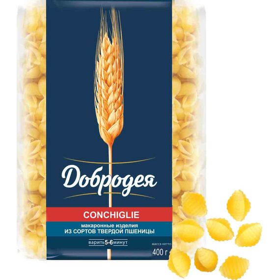Конкилье ТМ "Добродея" - это разновидность итальянской пасты, напоминающей своей формой морскую ракушку. Благодаря такой форме паста ребристая снаружи и гладкая внутри. Поэтому при перемешивании с соусом внутренняя часть Конкильи максимально заполняется, и в то же время ребристая поверхность захватывает соус снаружи. Эта разновидность пасты универсальна и подходит для любого рецепта.