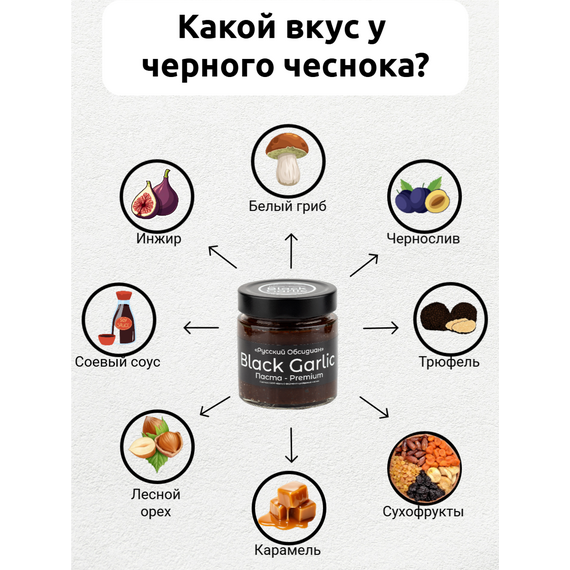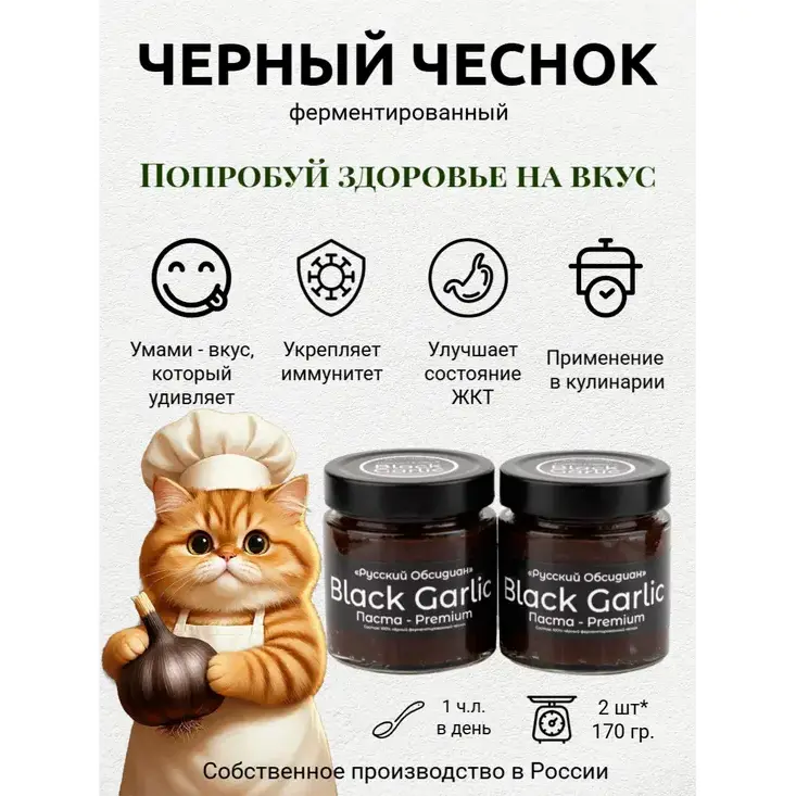 Паста из чёрного ферментированного чеснока Black Garlic Premium от «Русский Обсидиан» — это гастрономический деликатес нового поколения, полностью натуральный и произведённый в России. Каждый этап — от отбора чеснока до упаковки — проходит под полным контролем на собственном производстве, что обеспечивает высочайшее качество и максимальную пользу.
