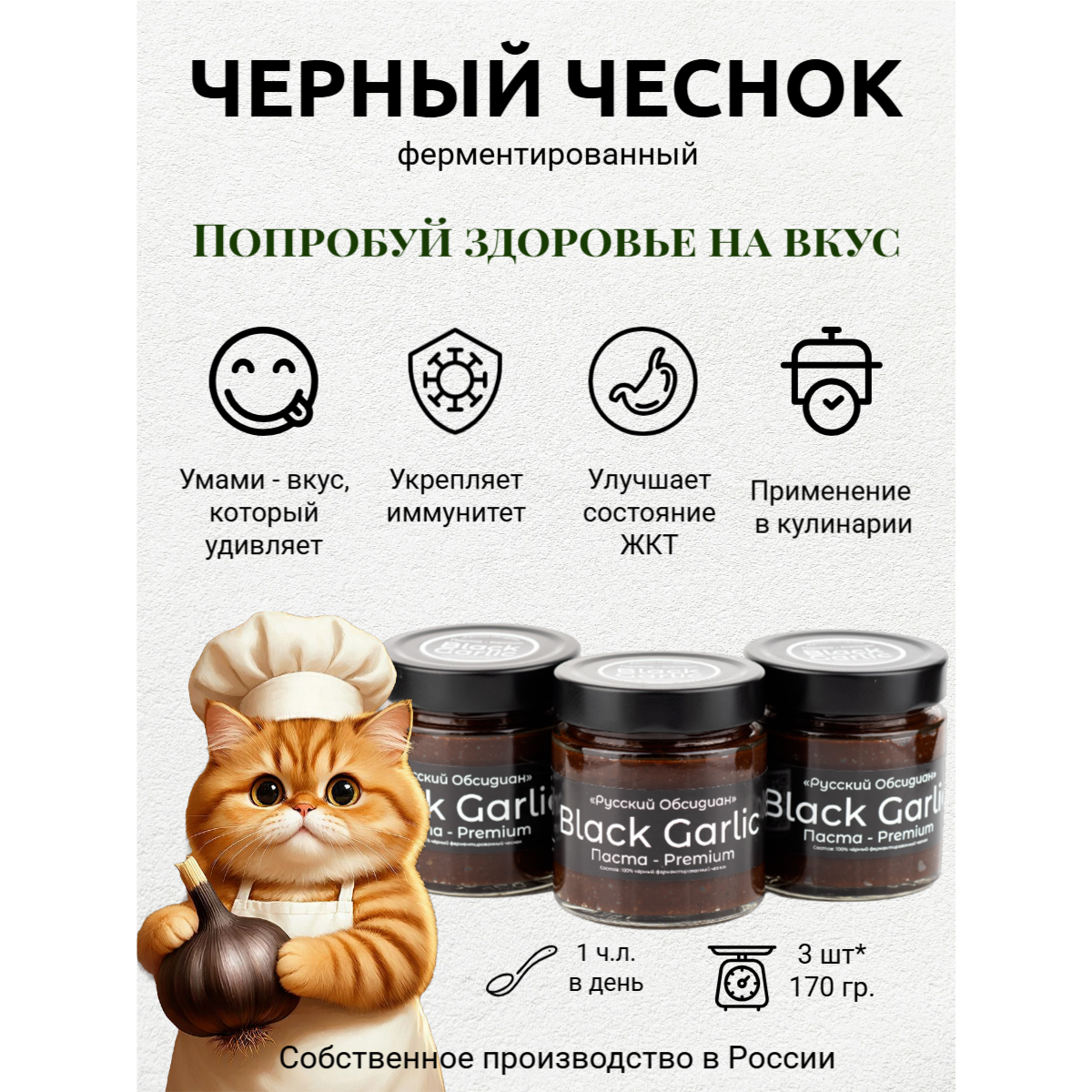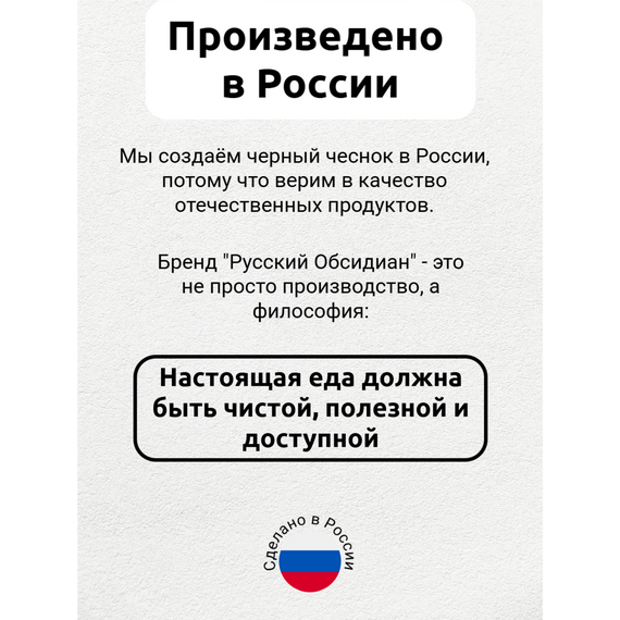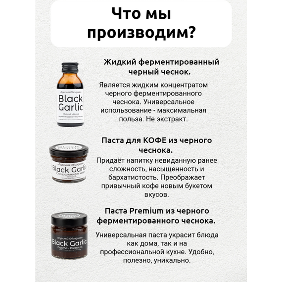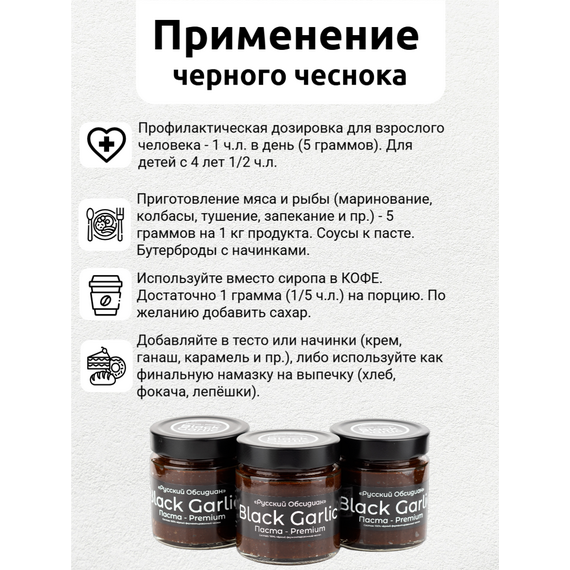 Паста из чёрного ферментированного чеснока Black Garlic Premium от «Русский Обсидиан» — это гастрономический деликатес нового поколения, полностью натуральный и произведённый в России. Каждый этап — от отбора чеснока до упаковки — проходит под полным контролем на собственном производстве, что обеспечивает высочайшее качество и максимальную пользу.