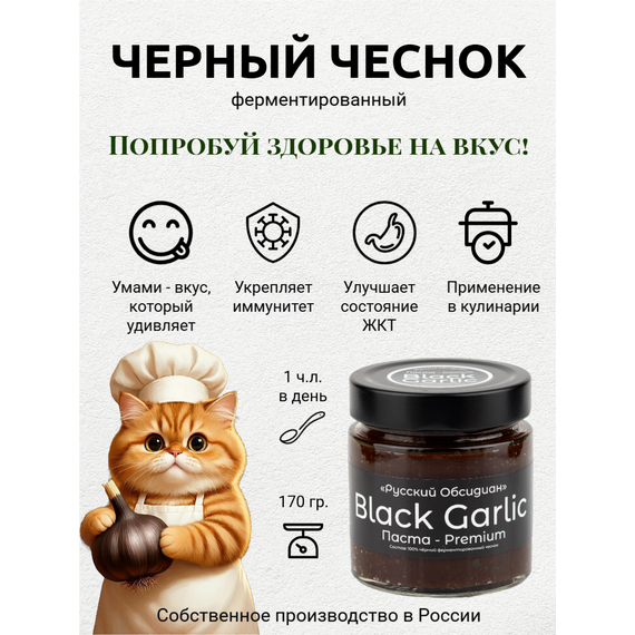 Паста из чёрного ферментированного чеснока Black Garlic Premium от «Русский Обсидиан» — это гастрономический деликатес нового поколения, полностью натуральный и произведённый в России. Каждый этап — от отбора чеснока до упаковки — проходит под полным контролем на собственном производстве, что обеспечивает высочайшее качество и максимальную пользу.