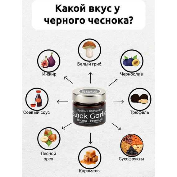 Паста из чёрного ферментированного чеснока Black Garlic Premium от «Русский Обсидиан» — это гастрономический деликатес нового поколения, полностью натуральный и произведённый в России. Каждый этап — от отбора чеснока до упаковки — проходит под полным контролем на собственном производстве, что обеспечивает высочайшее качество и максимальную пользу.