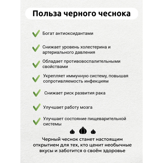 - Чёрный чеснок содержит в 2-3 раза больше антиоксидантов, чем обычный чеснок, что укрепляет иммунитет и препятствует старению.