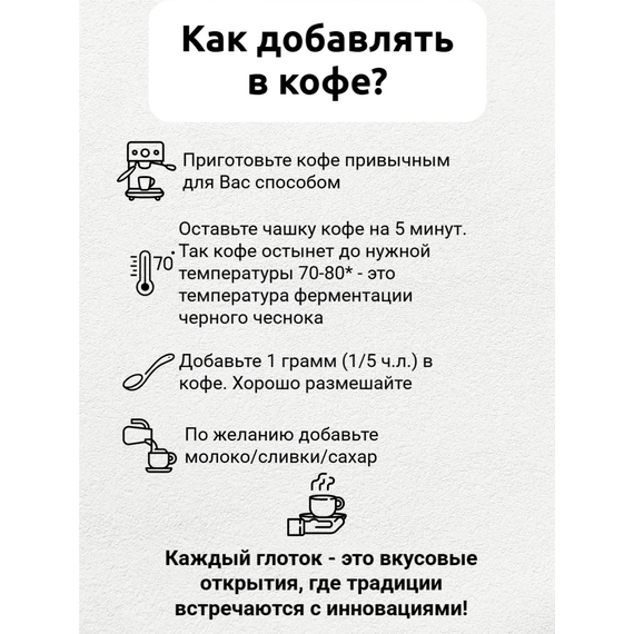 Сочетая в себе лучшие качества чёрного ферментированного чеснока наша паста не только делает кофе оригинальным, но и добавляет вашему напитку элемент заботы о здоровье без резкого запаха и послевкусия классического чеснока.