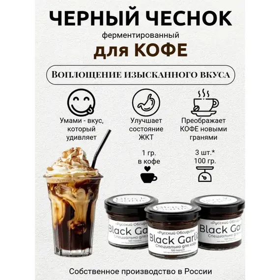 Попробуйте пасту Black Garlic для кофе от «Русский Обсидиан» и откройте для себя ваш любимый напиток с новой, удивительной стороны. В одной упаковке — 100 порций. Удобно, выгодно, интересно! 100% натуральный продукт собственного производства — гарантия качества и уникальности каждого вкуса.