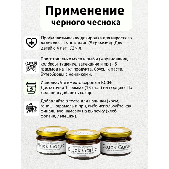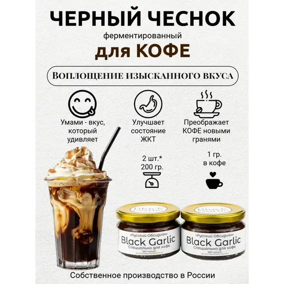 Попробуйте пасту Black Garlic для кофе от «Русский Обсидиан» и откройте для себя ваш любимый напиток с новой, удивительной стороны. В одной упаковке — 100 порций. Удобно, выгодно, интересно! 100% натуральный продукт собственного производства — гарантия качества и уникальности каждого вкуса.