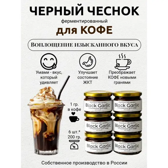 Сочетая в себе лучшие качества чёрного ферментированного чеснока наша паста не только делает кофе оригинальным, но и добавляет вашему напитку элемент заботы о здоровье без резкого запаха и послевкусия классического чеснока.