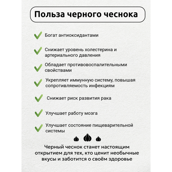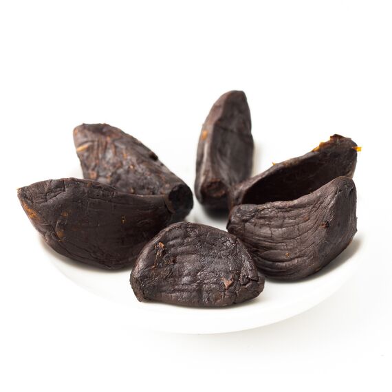 Чёрный чеснок — это результат контролируемой упрочнённой ферментации свежих головок чеснока при определённой температуре и влажности. За 30–40 дней традиционный чеснок превращается в деликатес с роскошным, глубоким, многослойным вкусом и шелковистой, пастообразной текстурой. Его дольки приобретают насыщенный чёрный цвет, теряя обычную остроту и резкость.