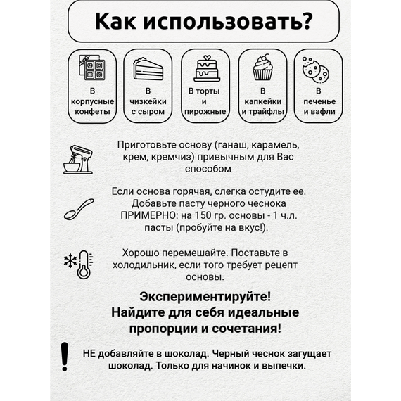 - Используйте чёрный чеснок для создания изысканных начинок корпусных шоколадных конфет и трюфелей.