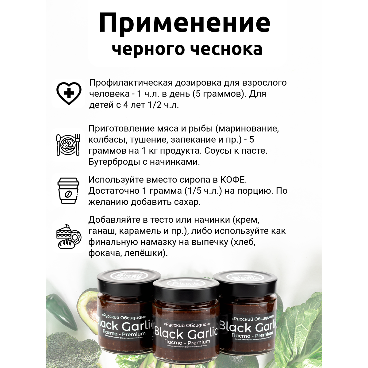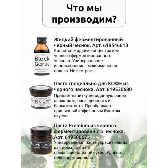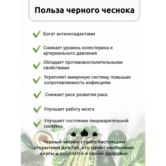 Выбирайте продукты, которые заботятся о вашем здоровье каждый день. Черный чеснок станет надежным спутником вашего пути к активному долголетию и хорошему самочувствию.
