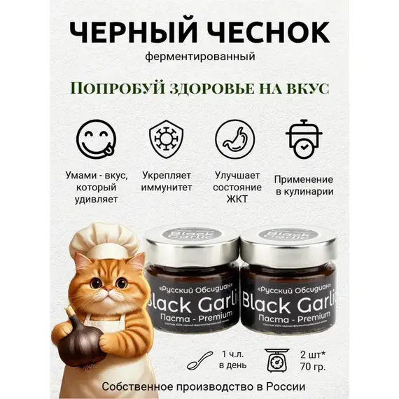 Паста из чёрного ферментированного чеснока Black Garlic Premium от «Русский Обсидиан» — это гастрономический деликатес нового поколения, полностью натуральный и произведённый в России. Каждый этап — от отбора чеснока до упаковки — проходит под полным контролем на собственном производстве, что обеспечивает высочайшее качество и максимальную пользу.