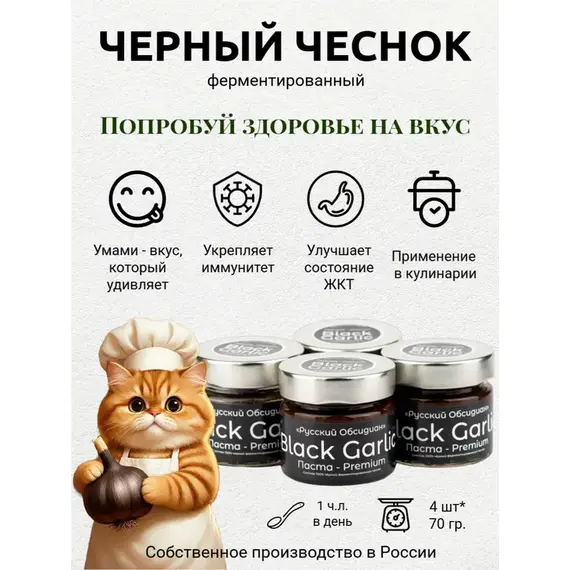 Паста из чёрного ферментированного чеснока Black Garlic Premium от «Русский Обсидиан» — это гастрономический деликатес нового поколения, полностью натуральный и произведённый в России. Каждый этап — от отбора чеснока до упаковки — проходит под полным контролем на собственном производстве, что обеспечивает высочайшее качество и максимальную пользу.