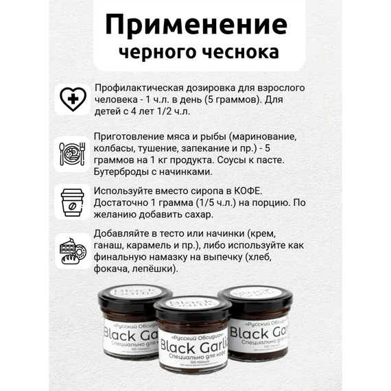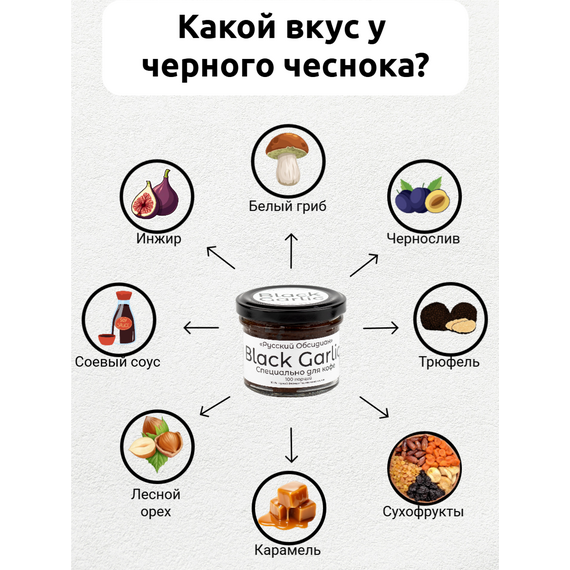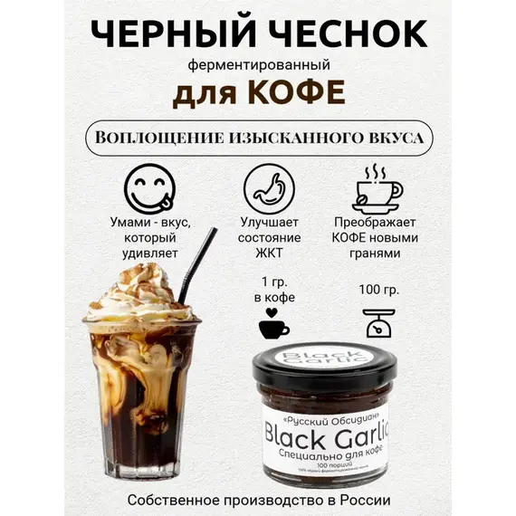 Попробуйте пасту Black Garlic для кофе от «Русский Обсидиан» и откройте для себя ваш любимый напиток с новой, удивительной стороны. В одной упаковке — 100 порций. Удобно, выгодно, интересно! 100% натуральный продукт собственного производства — гарантия качества и уникальности каждого вкуса.