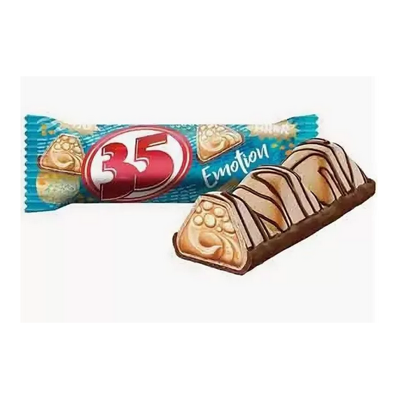 Конфеты «35» — вкусный, хрустящий батончик на основе полых вафель, частично глазированный, с морской солью и кранчами со вкусом карамели.