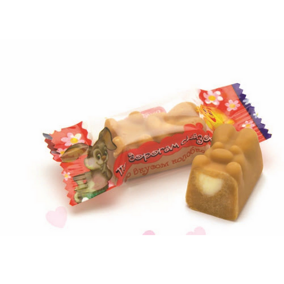 Конфеты По дорогам сказок со вкусом Колобка " - Дико вкусные! Вкушать их рекомендуется по маленькому кусочку, наслаждаясь вкусной двухслойной начинкой. Неглазированные конфеты с молочным корпусом и молочно-кремовой начинкой со вкусом бисквита. Конфеты в форме зайца.