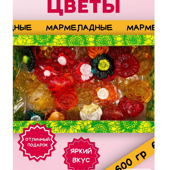 Мармелад в форме цветов является низкокалорийной сладостью, не содержит жир, обладает диетическими достоинствами. Фигурка из мармелада идеально подходят для украшения торта.