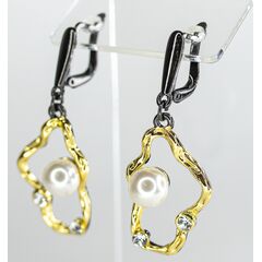 Серьги из гипоаллергенного ювелирного сплава черного и желтого цвета. Вставка- иск. жемчуг и ювелирное стекло белого цвета. Высота серег -4,5см, ширина -2,0см. Английский замок ( швенза-1,0см).